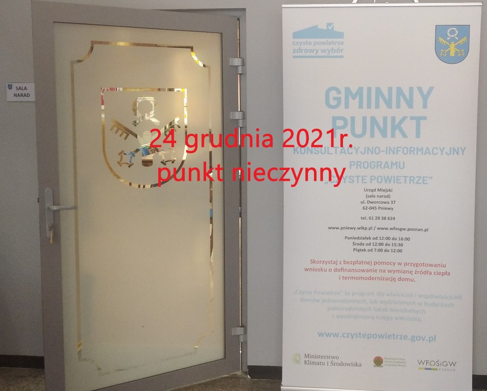Informujemy, że dnia 24 grudnia 2021r. punkt konsultacyjno-informacyjny programu „Czyste Powietrze” będzie nieczynny.