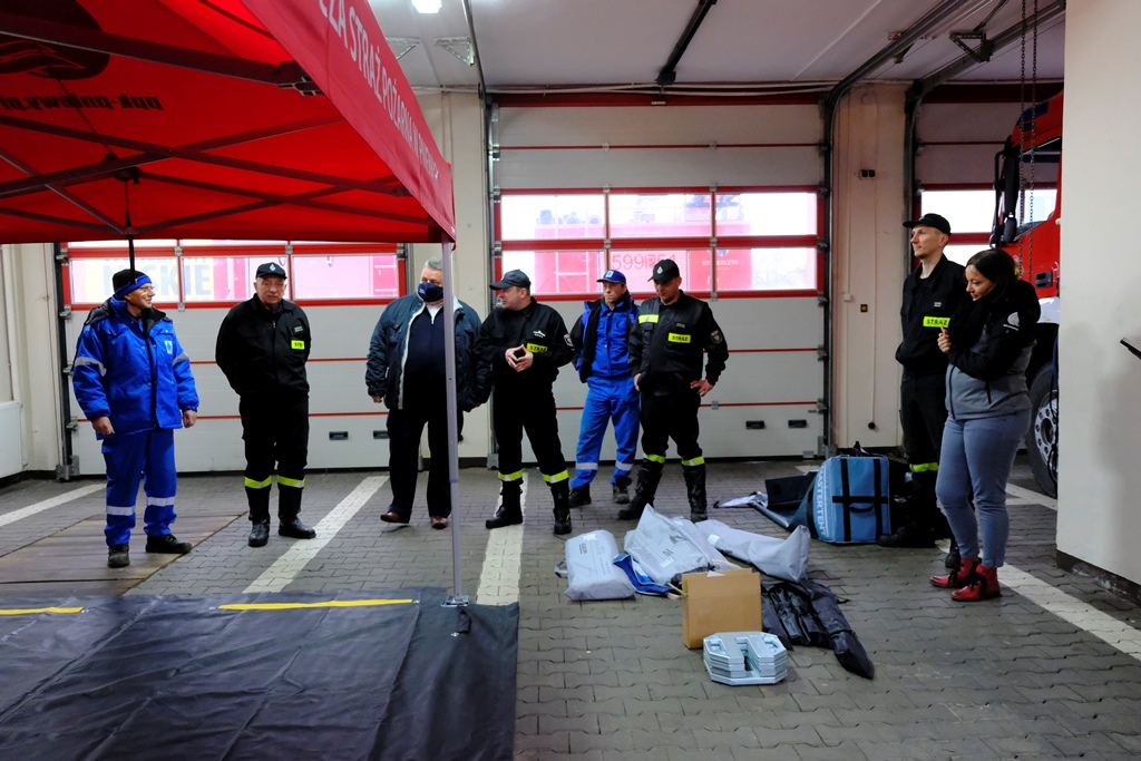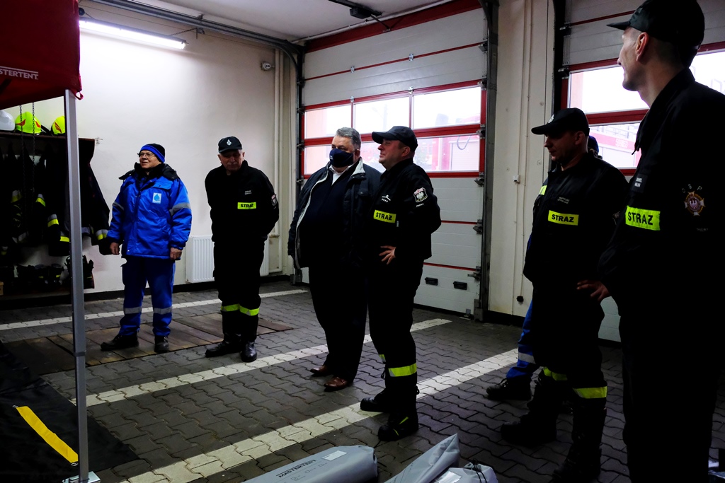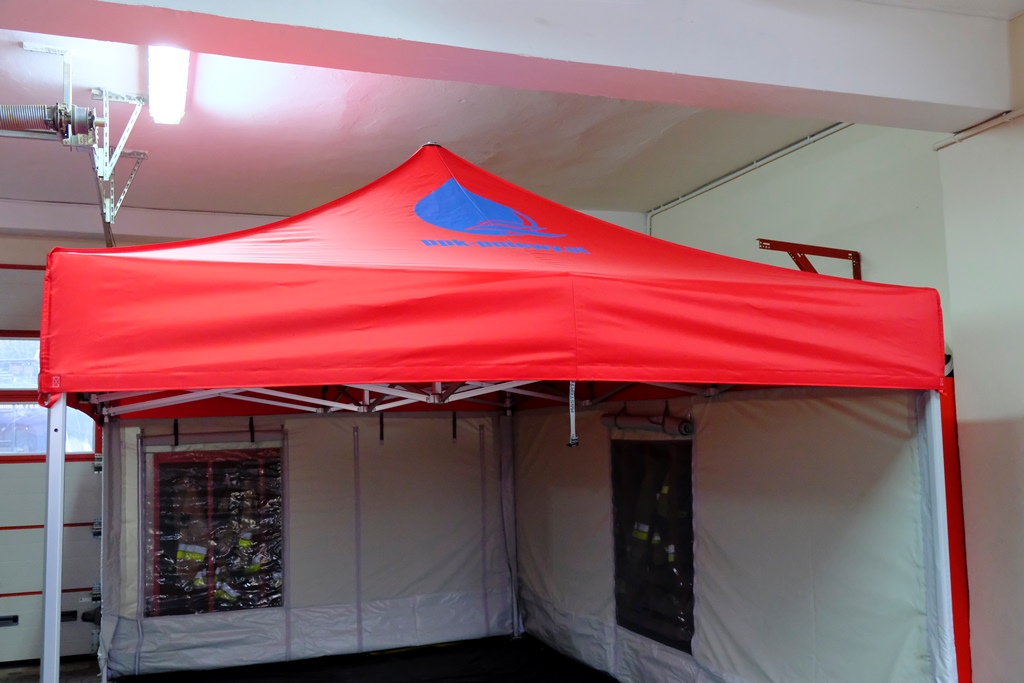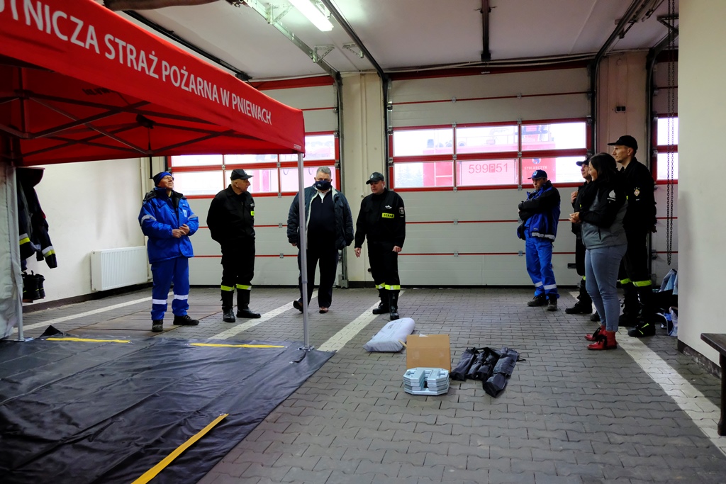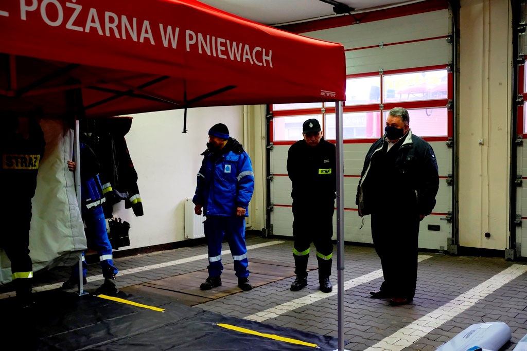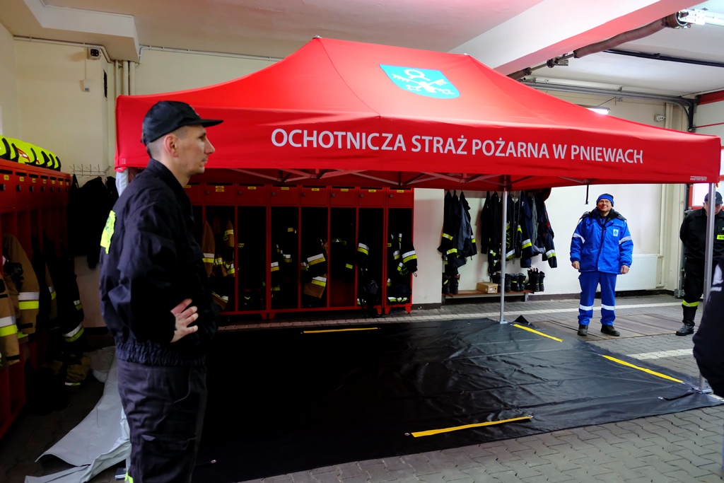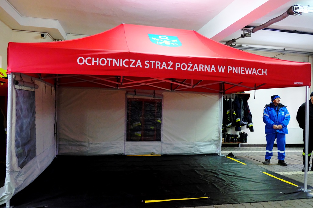 W dniu dzisiejszym Burmistrz Gminy Pniewy Jarosław Przewoźny wraz z Prezes Pniewskiego Przedsiębiorstwa Komunalnego Panią Romaną Kozub odwiedzili jednostkę Ochotniczej Straży Pożarnej w Pniewach by przekazać nowo zakupiony namiot.  Nowe doposażenie będzie służyło strażakom m.in. w trakcie długotrwałych akcji ratowniczo-gaśniczych, czy w sytuacjach wyjątkowych, jako tymczasowe miejsce do przechowywania sprzętu oraz żywności. Będzie mógł być także użyty podczas organizacji imprez o charakterze kulturalno-sportowym, czy jako miejsce spożywania posiłków podczas różnego rodzaju wydarzeń.