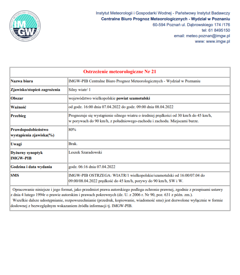 Ostrzeżenie meteorologiczne- SILNY WIATR!
