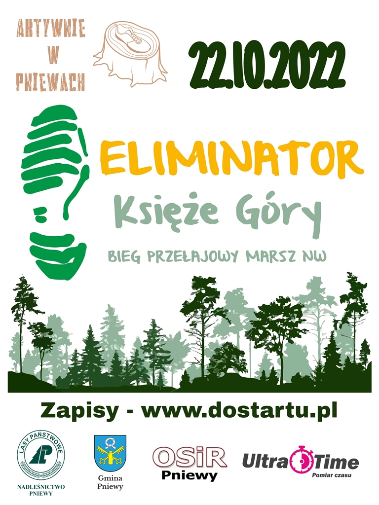 Klub Biegowo Sportowy Aktywnie w Pniewach zaprasza na III Edycję Eliminatora. Bieg tradycyjnie odbędzie się w Księżych Górach w Pniewach. Formuła Biegu jest podobna jak w poprzednich latach: - Start dla wszystkich biegaczy odbędzie się po trasie ścieżek rekreacyjnych na Księżych Górach (pętla ok 2,5 km z zastrzeżeniem, że pętla może się minimalnie skrócić lub wydłużyć). - Wszyscy uczestnicy biegu pokonują 2 pętle tj ok 5km. - Po pierwszych dwóch pętlach na trasie zostaje 50% pierwszych biegaczy (z podziałem na 50% najszybszych kobiet i 50% najszybszych mężczyzn. - Po każdej kolejnej pętli obowiązuję ta sama zasada - zostaje na trasie po 50% M i 50 % K. - Bieg trwa do czasu kiedy na trasie zostanie(zależnie od l. uczestników) od 3do 6 osób z każdej kategorii (K i M). Podstawą ustalenia klasyfikacji generalnej biegu będą uzyskane wyniki według elektronicznego pomiaru czasu brutto. Klasyfikacje: 1. Bieg
