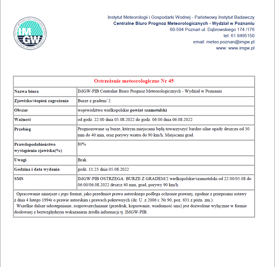 Komunikat ostrzegawczy - burze oraz opady deszczu