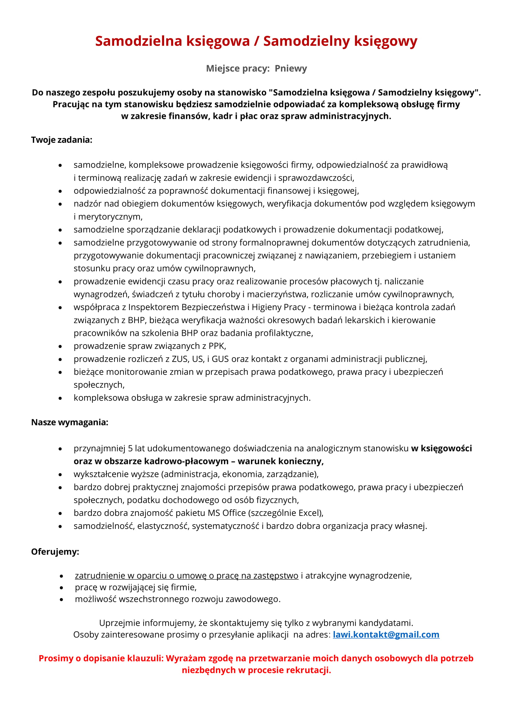 Oferta pracy- SAMODZIELNA KSIĘGOWA/ SAMODZIELNY KSIĘGOWY