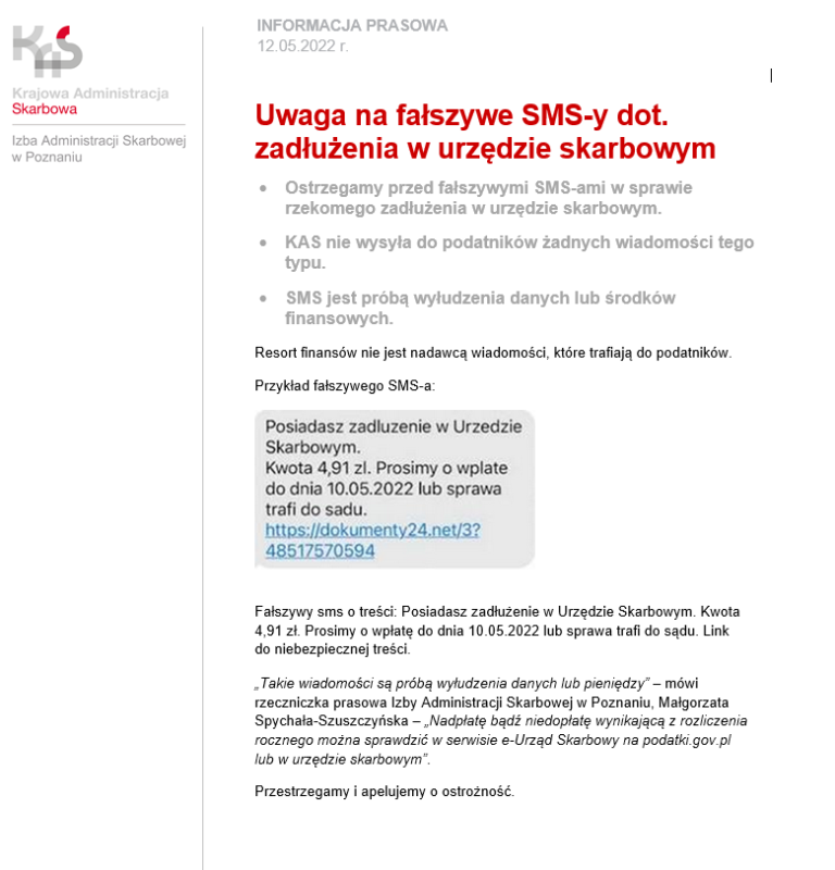 Uwaga na fałszywe SMS-y dotyczące zadłużenia w urzędzie skarbowym