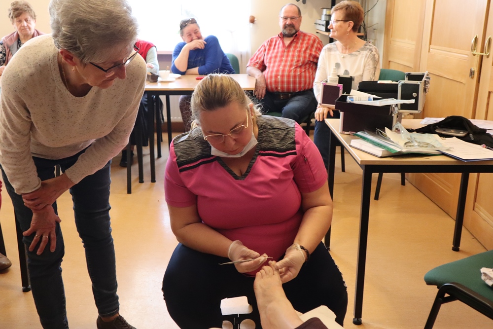 W czwartek 24 marca 2022 r. Seniorzy DDS w Pniewach gościli podologa Panią Iwonę Barcerek. Podczas spotkania Pani Iwona udzieliła wiele cennych wskazówek dotyczących pielęgnacji domowej stóp, tak ważnego narządu ruchu, o który szczególnie musimy dbać. Na przykładzie wykonanego jednej Seniorce zabiegu pielęgnacyjnego omówiła najczęściej występujące problemy ze stopami. Ponadto wskazała, iż na pierwszej wizycie w gabinecie należy informować podologa o przebytych chorobach i przyjmowanych lekach. Specjalista w zakresie stóp po dokładnych oględzinach stawia diagnozę i zaleca zabiegi, które poprawią ich kondycję.