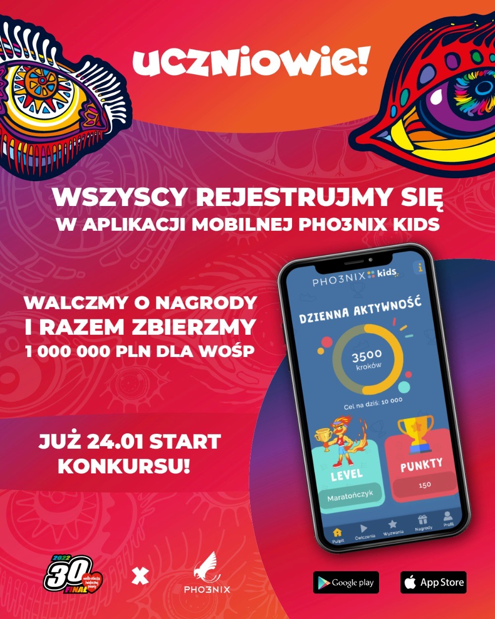 Zapraszamy do konkursu sportowego uczniów klas 1-3 oraz 4-8 Szkoły Podstawowej w Pniewach. Konkurs polega na zebraniu jak największej liczby kroków przez uczniów klas 1-3 oraz 4-8. Zbieramy kroki od 31 stycznia do 6 lutego w aplikacji mobilnej Pho3nix Kids. Każdy uczeń, który wykona w aplikacji minimum 1000 kroków w okresie trwania konkursu, Fundacja Pho3nix przekaże na konto WOŚP 5 zł. Zachęcamy wszystkich uczniów do bezpłatnej rejestracji w aplikacji mobilnej Pho3nix Kids.