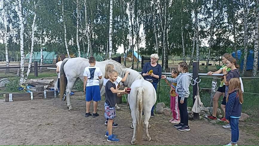 W sobotę 4 września kolejny, trzeci już raz, spotkaliśmy się, by być „Znowu razem z uśmiechem”. Tym razem byliśmy w Stajni Zadora w Zajączkowie. Część uczestników na miejsce dotarła rajdem rowerowym z Przystanek. Na miejscu czekała na nas pani Marysia Bielak, która opowiedziała o użytkowaniu koni i sportach jeździeckich. Wspólnie przygotowaliśmy klacze Alfę i Perełkę do jazdy i każdy, także dorośli, mogli spróbować jazdy konnej. Odbyły się też zawody w skokach przez przeszkody bez konia, zwycięzcy konkursów otrzymali nagrody i flo. Każdy mógł także spróbować ćwiczeń na koniu woltyżerskim, Hubercie, a także zaznajomić się z całą pozakońską ekipą Stajni Zadora-z psami, kotami i kozami. Posililiśmy się pyszną zupą, specjałami z ogniska, były także owoce i regeneracyjne słodycze.